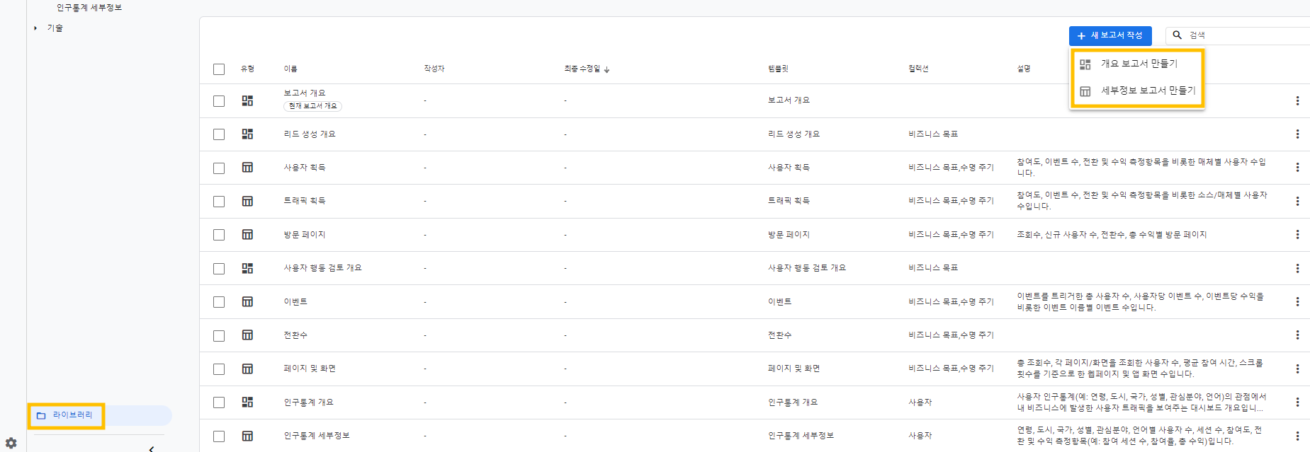 라이브러리 > 새 보고서 작성 > 개요 보고서 만들기 OR 세부정보 보고서 2가지 확인할 수 있음