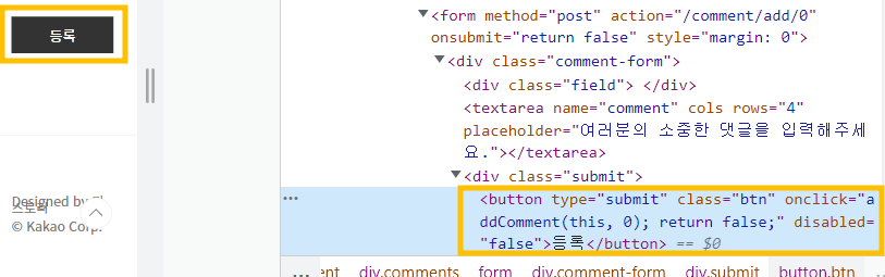 우측 개발자 도구 화면에서 버튼에 해당하는 HTML 코드가 하이라이트 되어 보인다