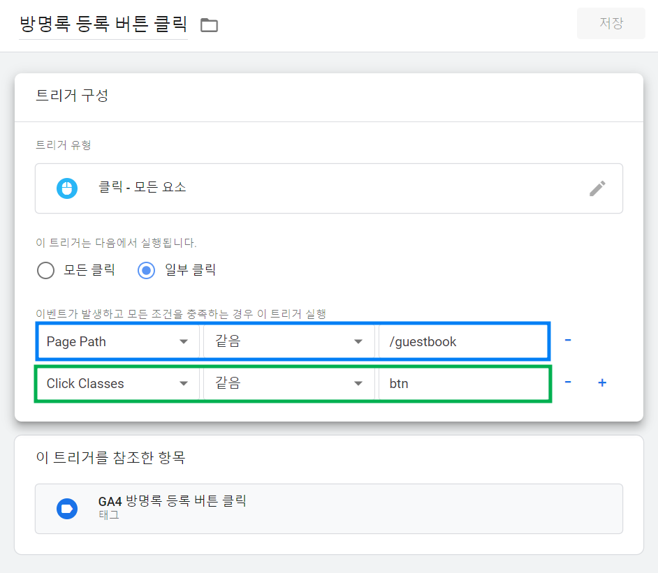 [2] 트리거 유형 : 버튼 클릭을 잡고 싶기 때문에 트리거 유형 > 클릭 부분 체크