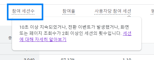 참여 세션 수 컬럼에서는 우리가 설정한 기간 동안 발생한 참여 세션 수 전체를 보여준다